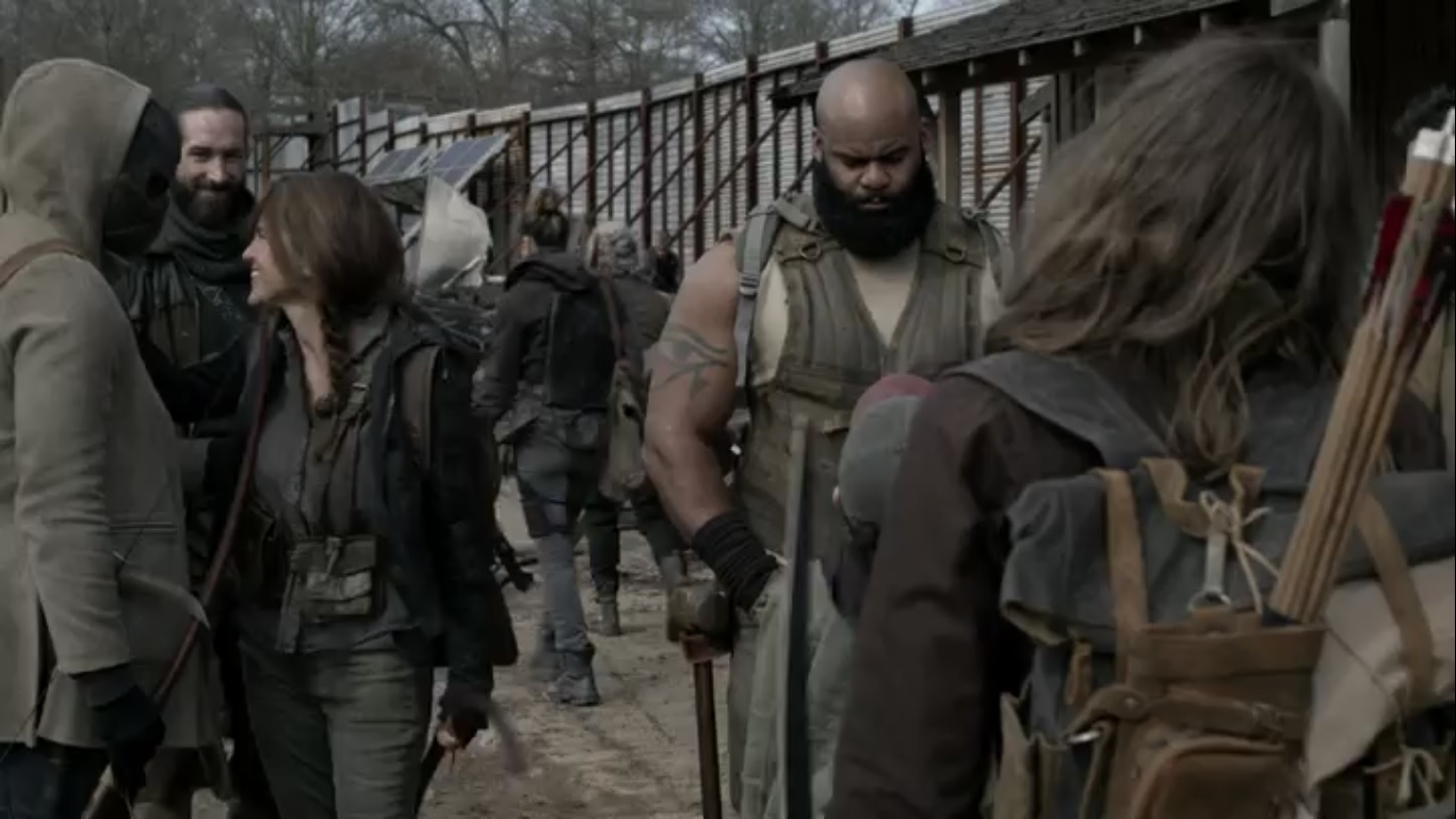Day breaks as everyone returns to Alexandria, which has seen better days. Repairs are still underway. Maggie is reunited with some old friends of hers: Duncan, played by Marcus Lewis, Frost, played by Glenn Stanton, and Agatha, played by Laurie Fortier.