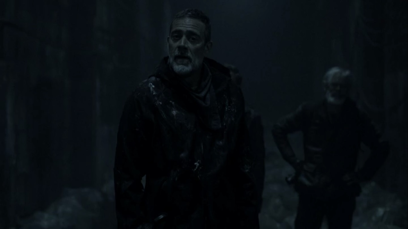 So they head through the tunnels, but the storm’s pushing in through the pipes and making them groan, which explains the noise. Luckily, nothing to worry about. Not yet, anyway. Negan believes this is God telling them to turn around, which Gabriel believes God would’ve run past him first.