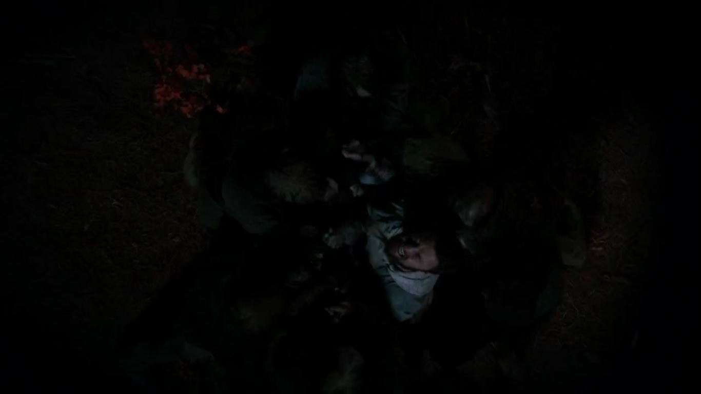 The episode begins with Aaron and Gracie making their way through the woods in the dead of night. They’re stopped by the arrival of a walker, a Savior, a Wolf, a Whisperer, and a partridge in a pear tree. Aaron puts down one walker, but when Gracie is suddenly no longer by his side, Aaron finds himself surrounded and stabbed to death.