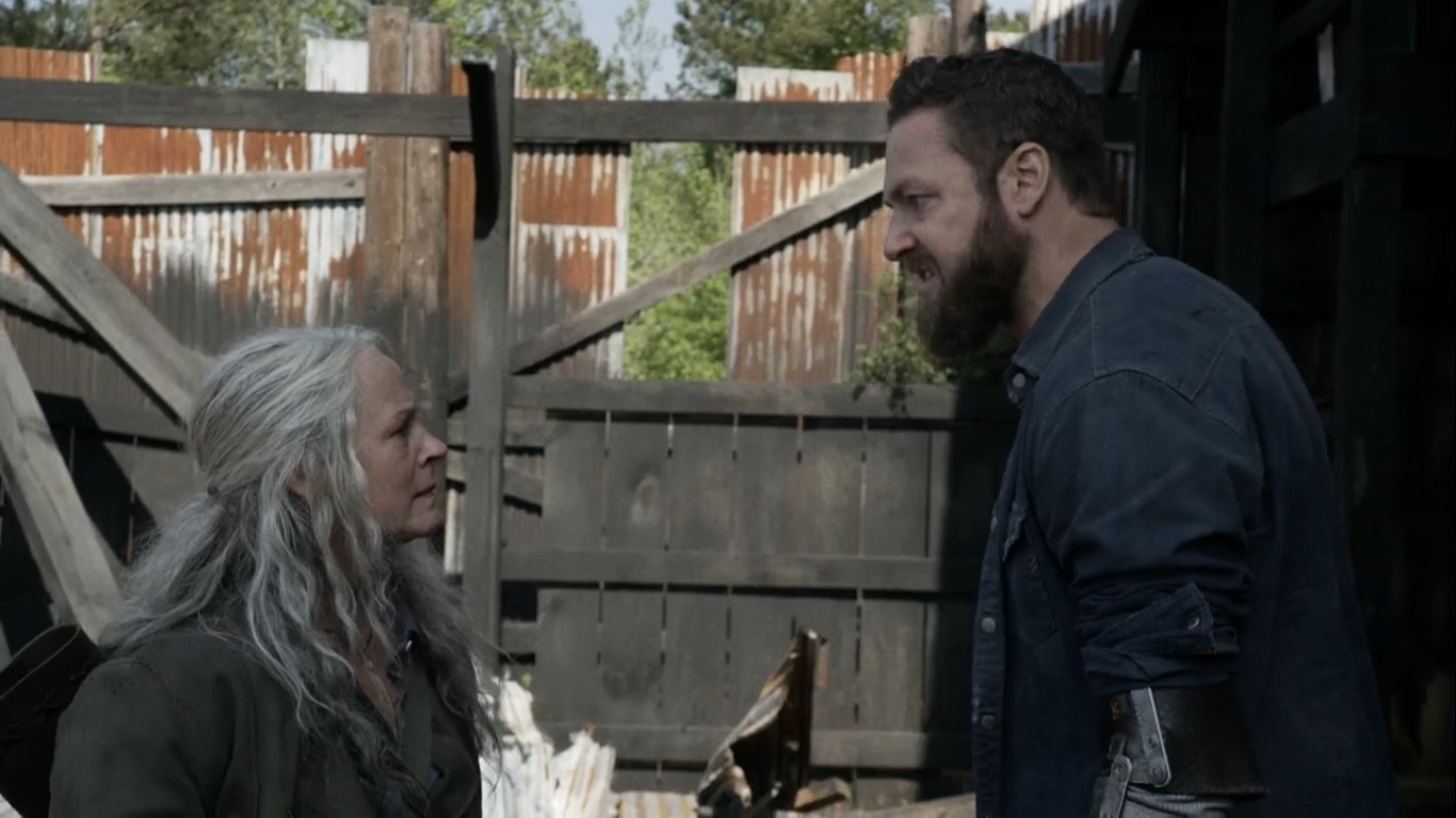 Aaron offers to cut off Keith’s hand to stop the infection, but Carol puts a stop to this by killing the walker. Aaron rages at her, saying she of all people should understand what they’re doing. After all, they’re standing on the ashes of what the Whisperers did, and now their people are going hungry.