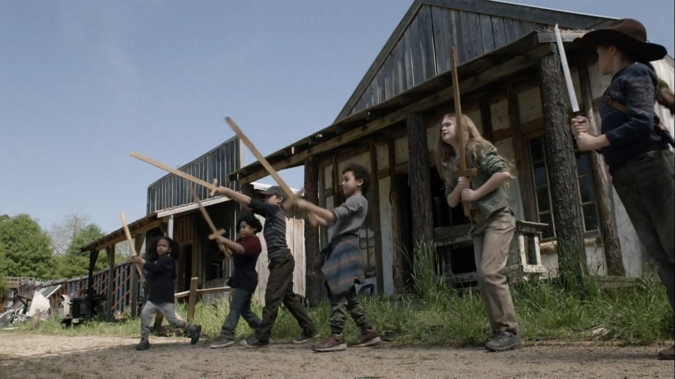 Because Judith has seen some serious shit in her life, she’s training the rest of the kids in Alexandria. She spots some older kids, that we’ve never seen before, messing with the walkers in one of the open parts of the wall. Judith threatens to tell Rosita, but one of the kids shoves her, saying she talks too much, which is probably why her mom abandoned her.