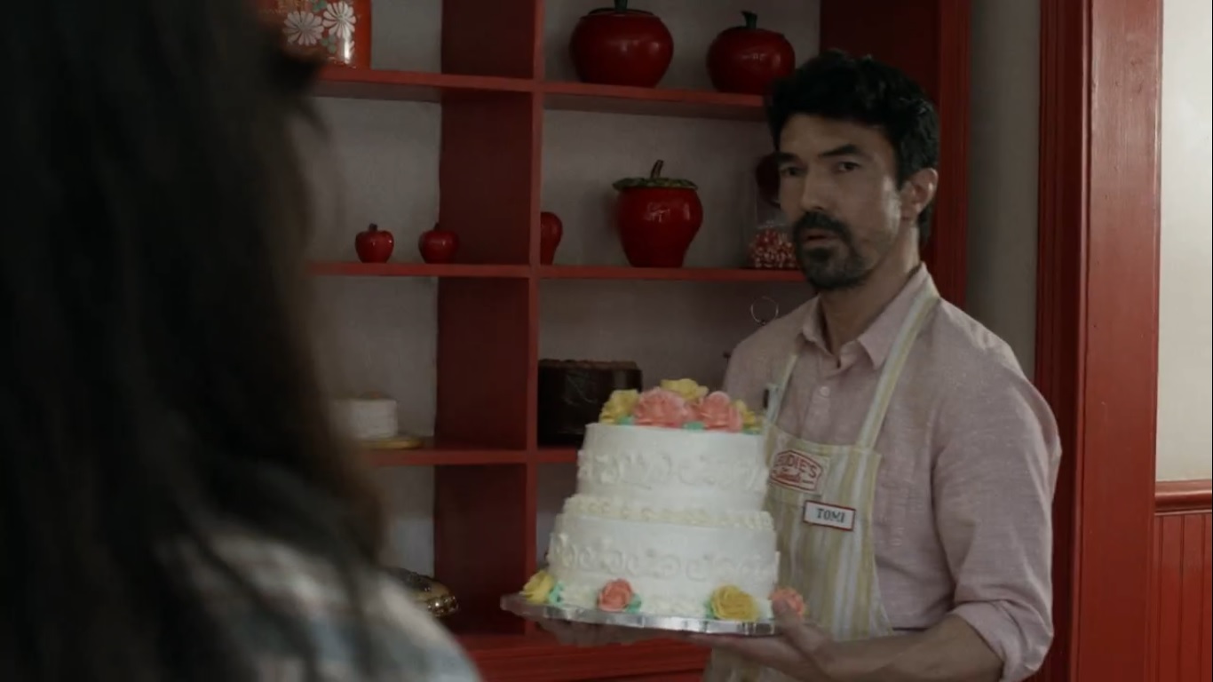 Back at the Commonwealth, Yumiko enters a bakery and is taken in by the sights and smells. She tells one employee that she’s looking for someone. When another employee, Tomi, played by Ian Anthony Dale, comes out with a cake, he drops it and is stunned into silence upon seeing Yumiko.
