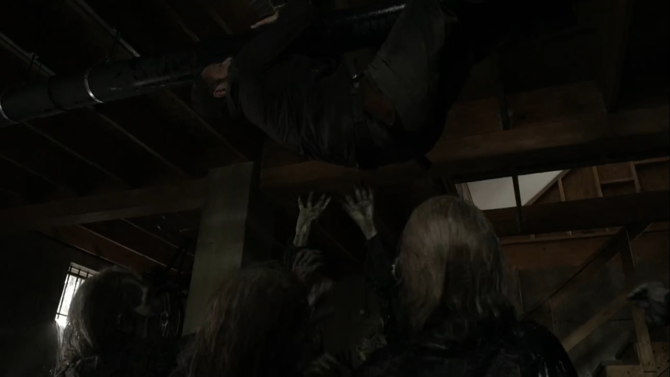 Talk about what? We’ll find out later. Rosita, Dianne, and Lydia keep taking out walkers. As Lydia heads to the cellar to find the source of that whistling sound, Aaron hangs for dear life on a pipe that surely can’t support his weight. Nonetheless, he shimmies across the swimming walkers and towards the window.