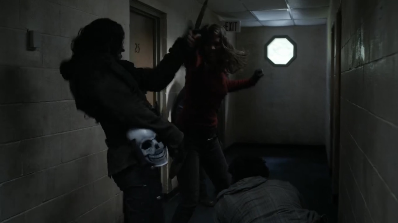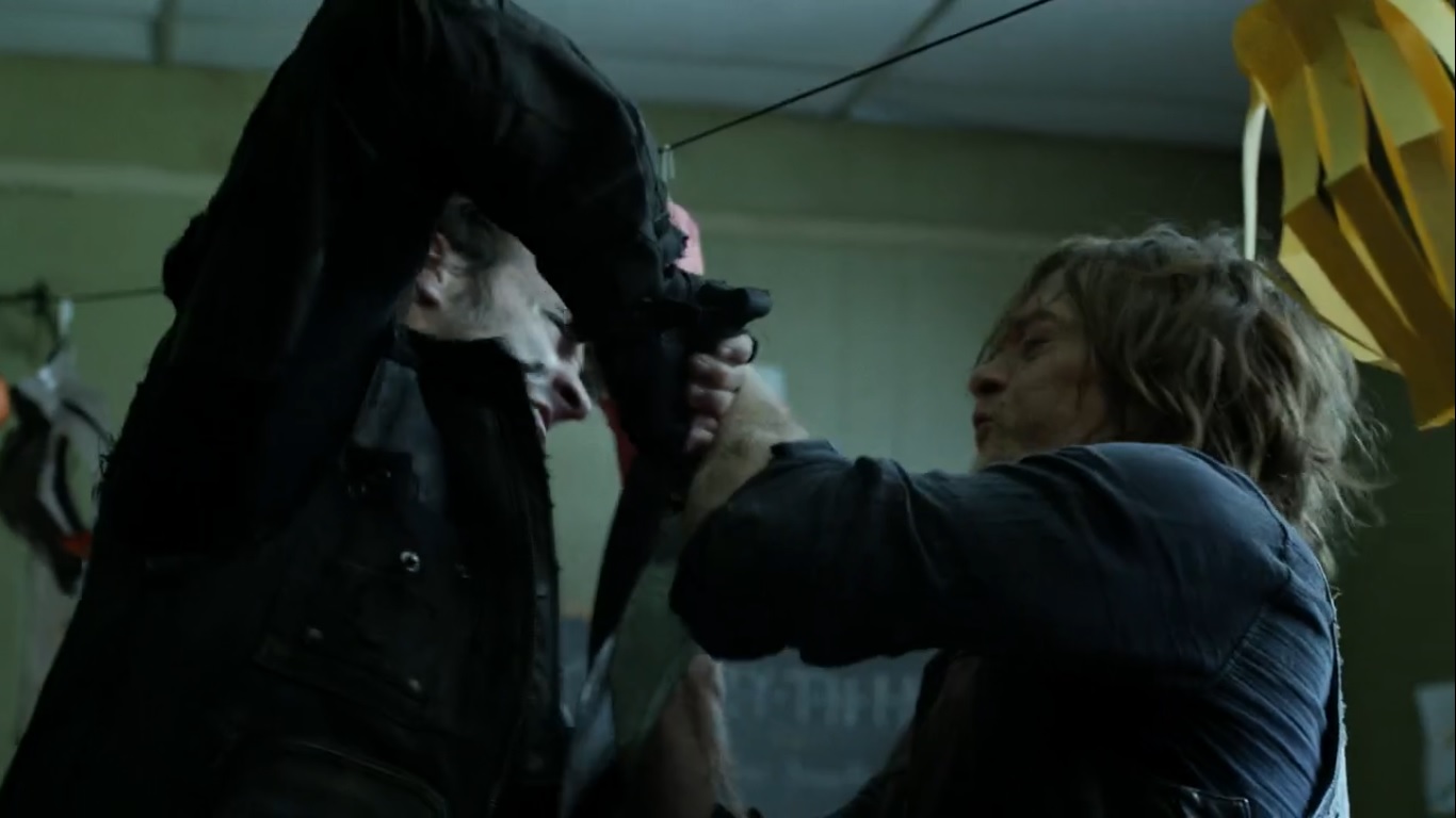 Anyway, dawn has broken at the Reaper compound. One Reaper, Austin, almost has a shot at a moving Gabriel when the Reaper is intercepted by Daryl. The two have their knife fight in a classroom, and though both get cut, Daryl soon gets the upper hand and tries to strangle Austin. When a walker outside the door is shot down, an approaching Reaper, Wash, calls out for Austin.