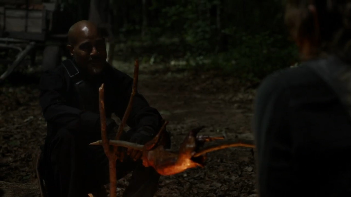 That night, over a campfire, Gabriel brings up with Daryl said. Daryl’s been thinking about the choices they’ve been making and whether they matter. But to Gabriel, that comes down to who’s making the choice. Doubt is important, but it doesn’t make you wrong. Yeah, Gabriel’s telling Daryl to have a bit of faith, while the pastor is trying to find it himself, too.