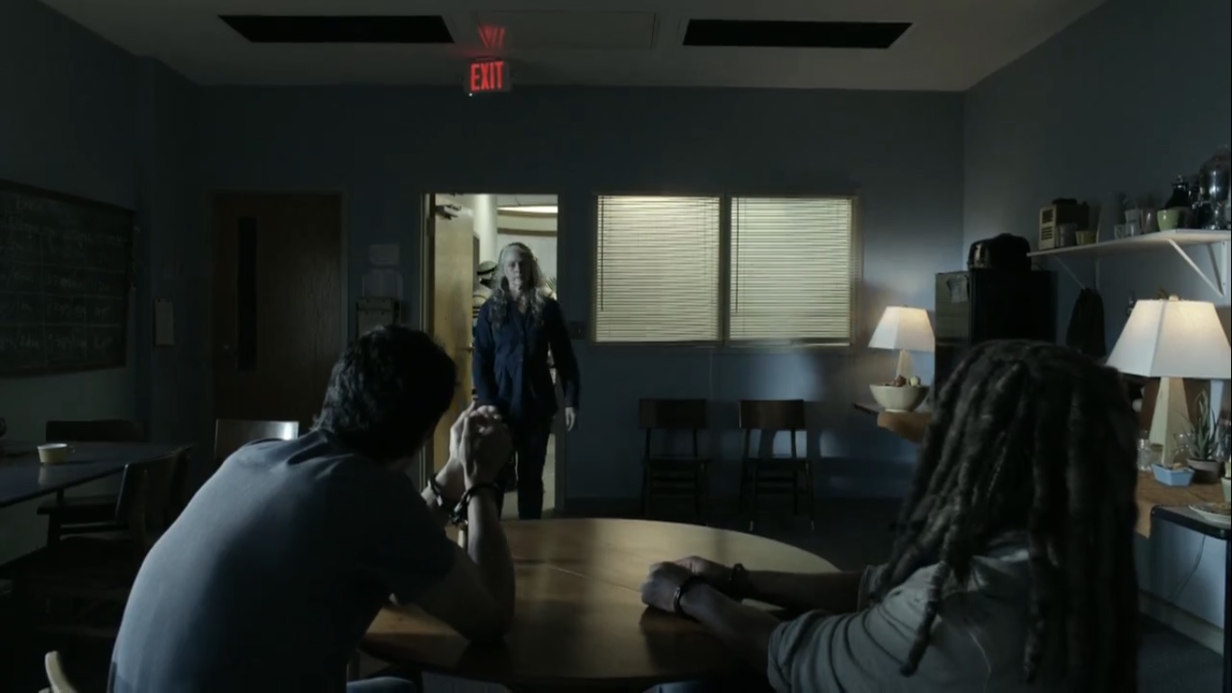 While cuffed, Tomi and Ezekiel are greeted not by a Commonwealth soldier, but Carol. Turns out Ezekiel may have mentioned her name, given her new job. They aren’t fucked, though. Carol handled it.