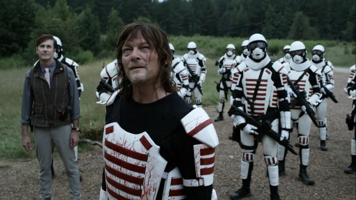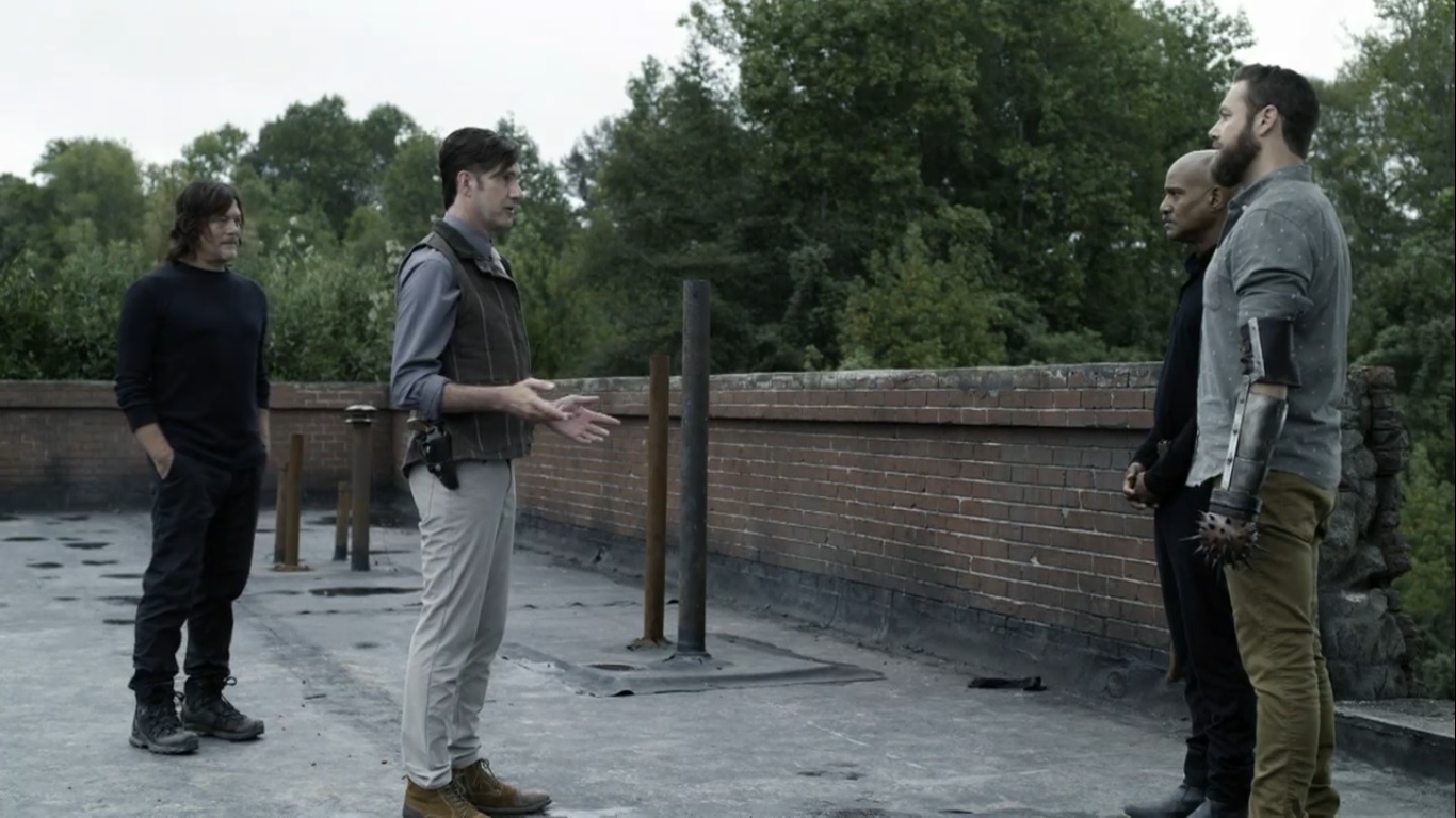 The episode begins with a crime scene investigation as Commonwealth soldiers examine the bodies of Carlson and the apartment residents he killed. On the roof, Lance informs Aaron, Gabriel, and Daryl that this situation puts them in a tough spot. He’s baffled that these residents somehow killed armed, trained soldiers, but spared Aaron and Gabriel.