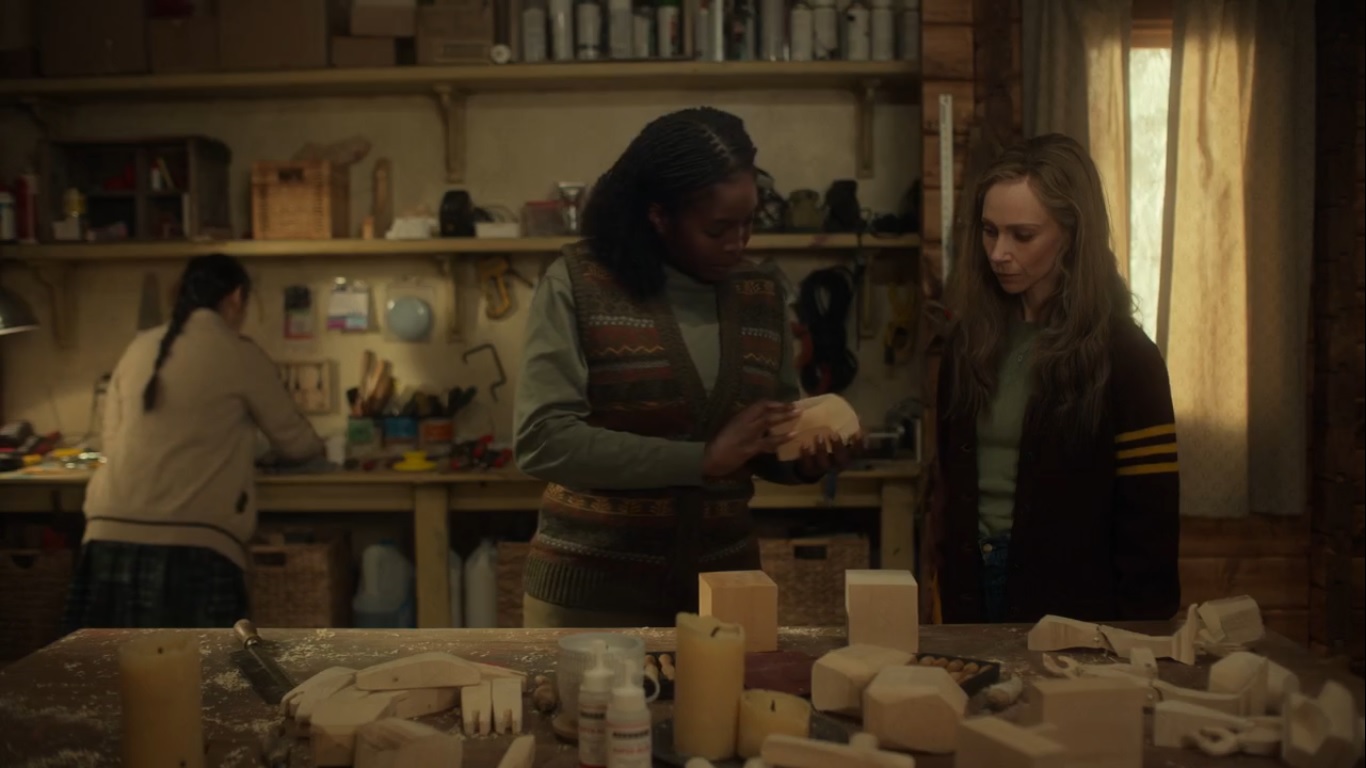 Back at Camp Utopia, Dot talks with…another Linda, this one played by Queeny Kuffour, about the puppet show. It’s a way of expelling the trauma, and then you take your new name and leave. Dot has a name already and doesn’t have time for this, as she has a mission. She’d rather take Linda and go instead of indulge in this puppet show nonsense, but she’s got no choice.