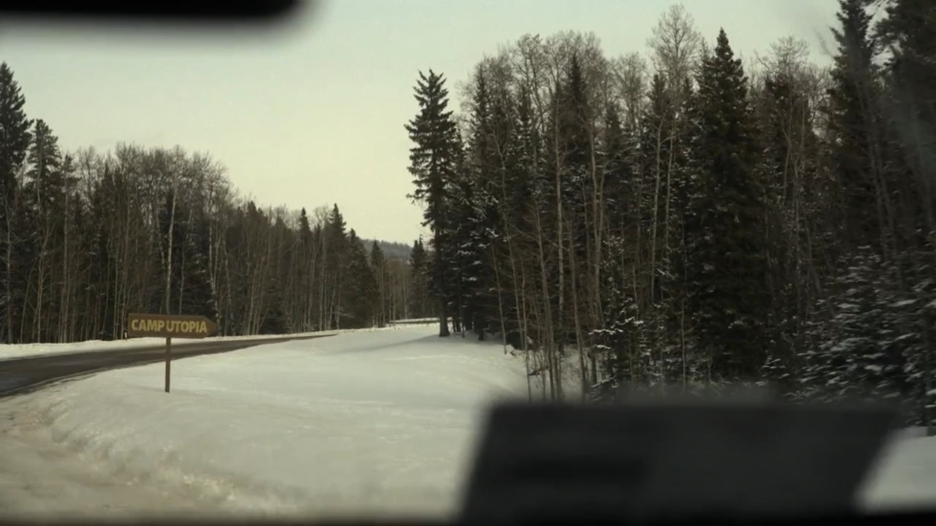 Back on the road, Dot passes a sign for Camp Utopia, but she soon finds herself low on gas. Of course, the car comes to a stop as Dot heads into the woods towards Camp Utopia. Convenient, but roll with it for now.
