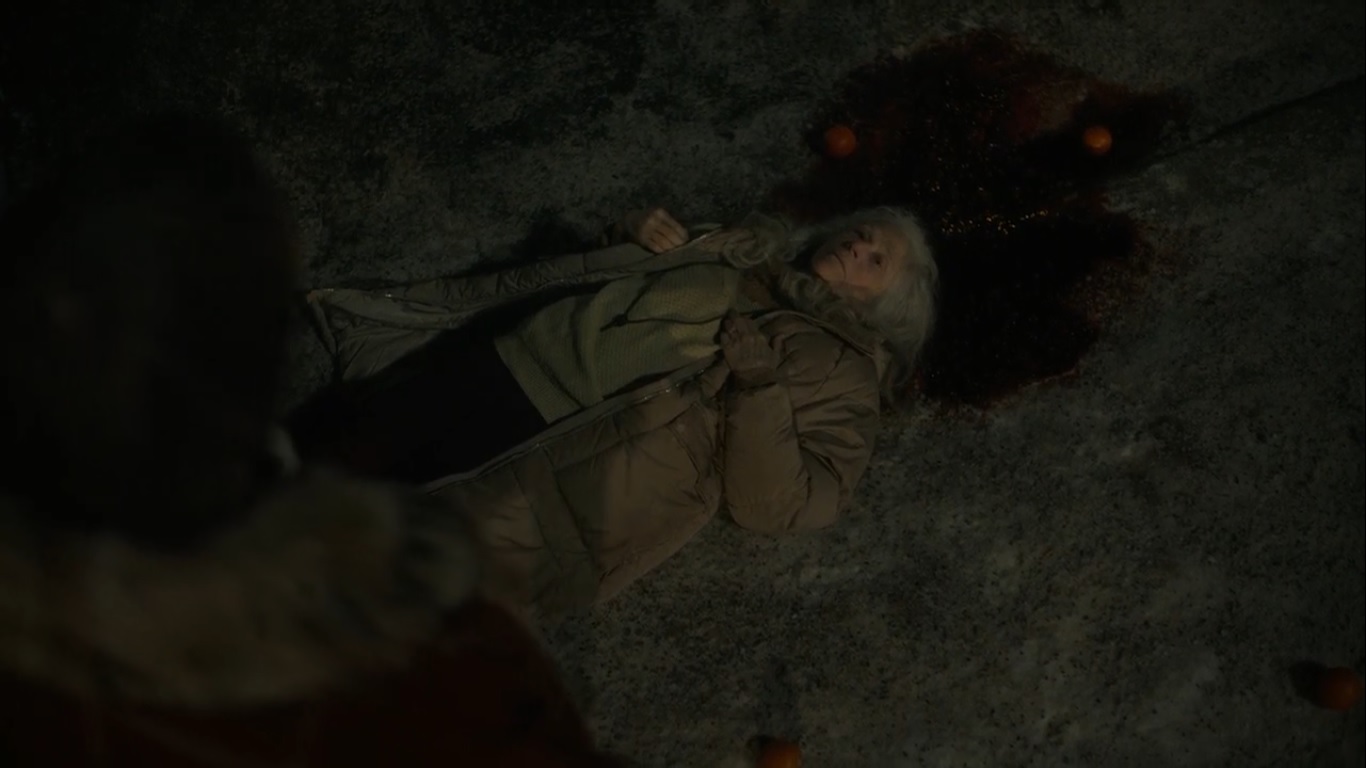Gator, believing he’s done the impossible, inspects the car and retrieves the tracker. He then checks the backseat and finds the bag of money in the backseat. He smashes one of the back window to get the bag of money, only for Mama Munch to start beating on him with a bag of oranges. Gator shoves her to the ground hard as the back of her head cracks against the icy pavement. Gator retrieves the money and flees.