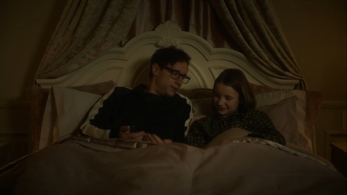 Back at the Lyon estate, Scotty joins her father inside, telling him that it’s bedtime. He’s got a story to read, so he decides to read from an invisible book. How novel. Chapter one tells the story of the hero named Dorothy, who was the son’s favorite. Everywhere she went, there were rainbows. She could do anything, like climb a tree or wrestle an alligator. Everyone she met, she put a smile on their faces.