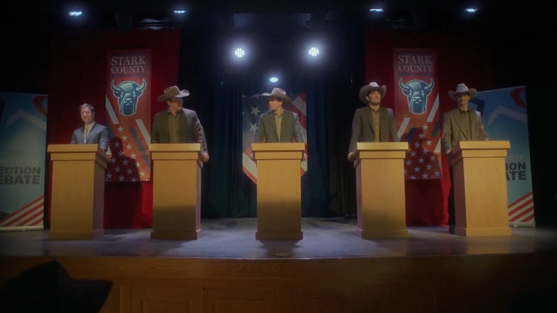 The moderator, Andrea Cordell, played by Chelsey Reist, asks Roy the first question: given the types of arrests seen in Stark County, how can he justify spending half a million dollars on weapons, tactical gear, and even a tank?