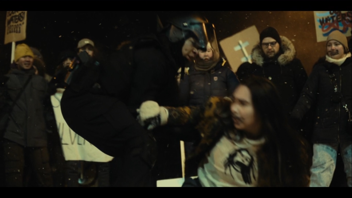 That song and its on-the-nose lyrics continue as Leah, Sheri, and that crowd protest outside of the mining company. At least their chant of “We were here before, gonna stay when you’re gone” is more clever than “Hey hey, ho ho, something something’s got to go.” As the workers head in, a scuffle breaks out between police and the protesters.