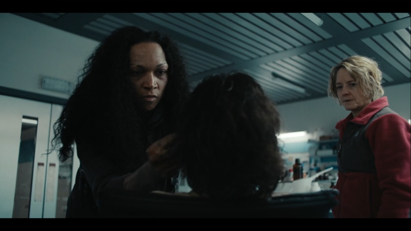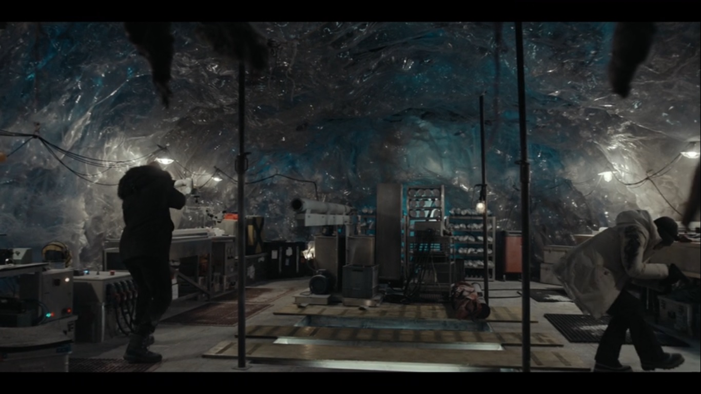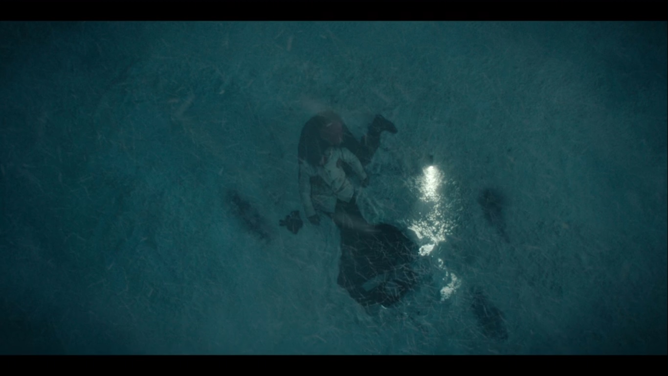 So let’s go with the theory that the women are responsible. Beatrice happens to notice the water going through the floor, finds a hidden facility, takes photos of evidence, and plans a revolt against the scientists because of their work polluting the land, as well as their involvement in Annie K’s death. There is no footage of the women storming the facility, or indication of tire tracks in the frozen ground. Just some folded clothes.